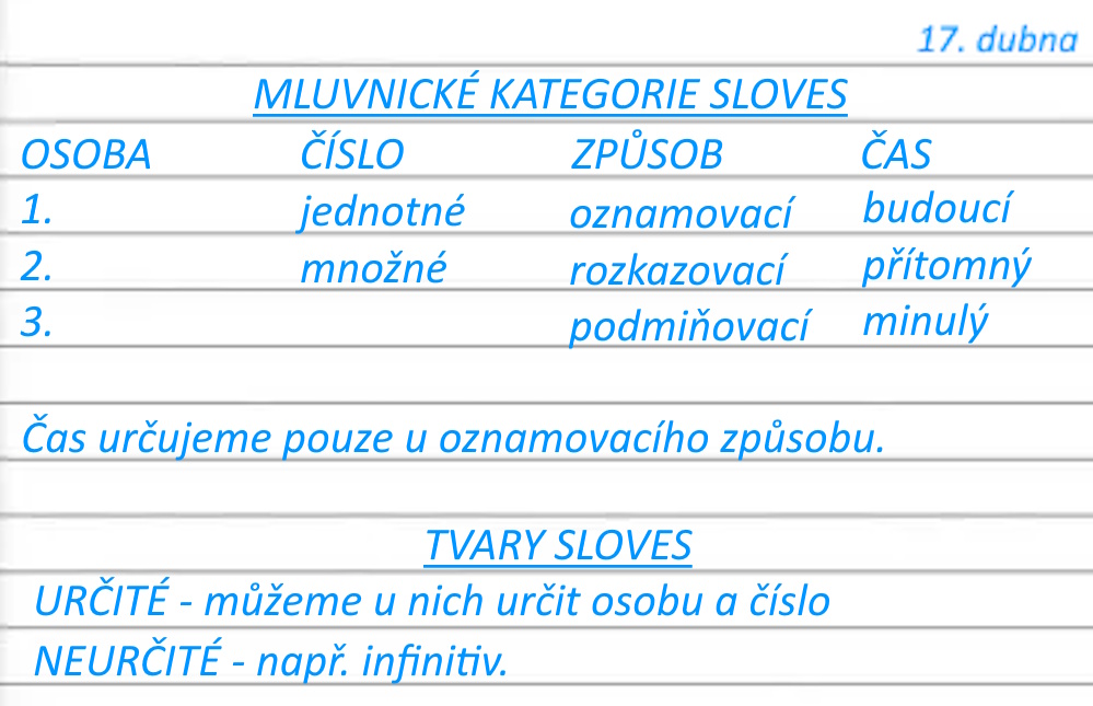 Čeština: Téma: Slovesné kategorie. Vyprávění. Aktivity: Hra. Zápis do sešitu (viz příloha). Zápis do čtenářského deníku. Slohová práce – vyprávění.