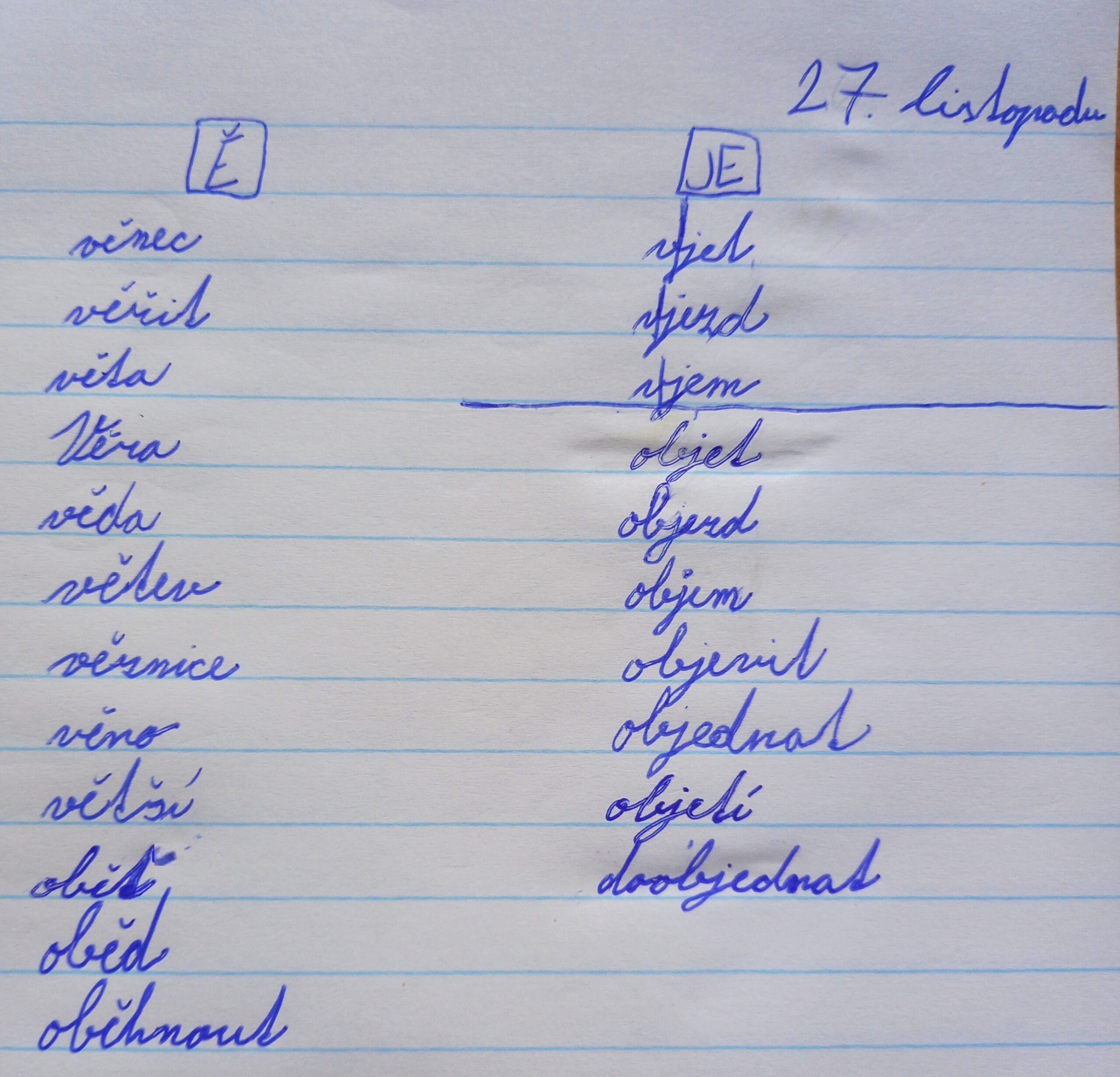 čtvrtek 4. 12.: test – ČJ: synonyma, antonyma, slova jednoznačná/mnohoznačná, nadřazená/podřazená/souřadná, citově zabarvená a neutrální, spisovná/nespisovná; slova s předponami vy-/vý-, nebo začínající na vi-/ví-; slova s předponami (nebo naopak bez předpon) od-, nad-, pod-, před-, roz-, bez-, vz-; slova s předponami ob-, v-, nebo začínající na na obě-, vě-; slovní druhy