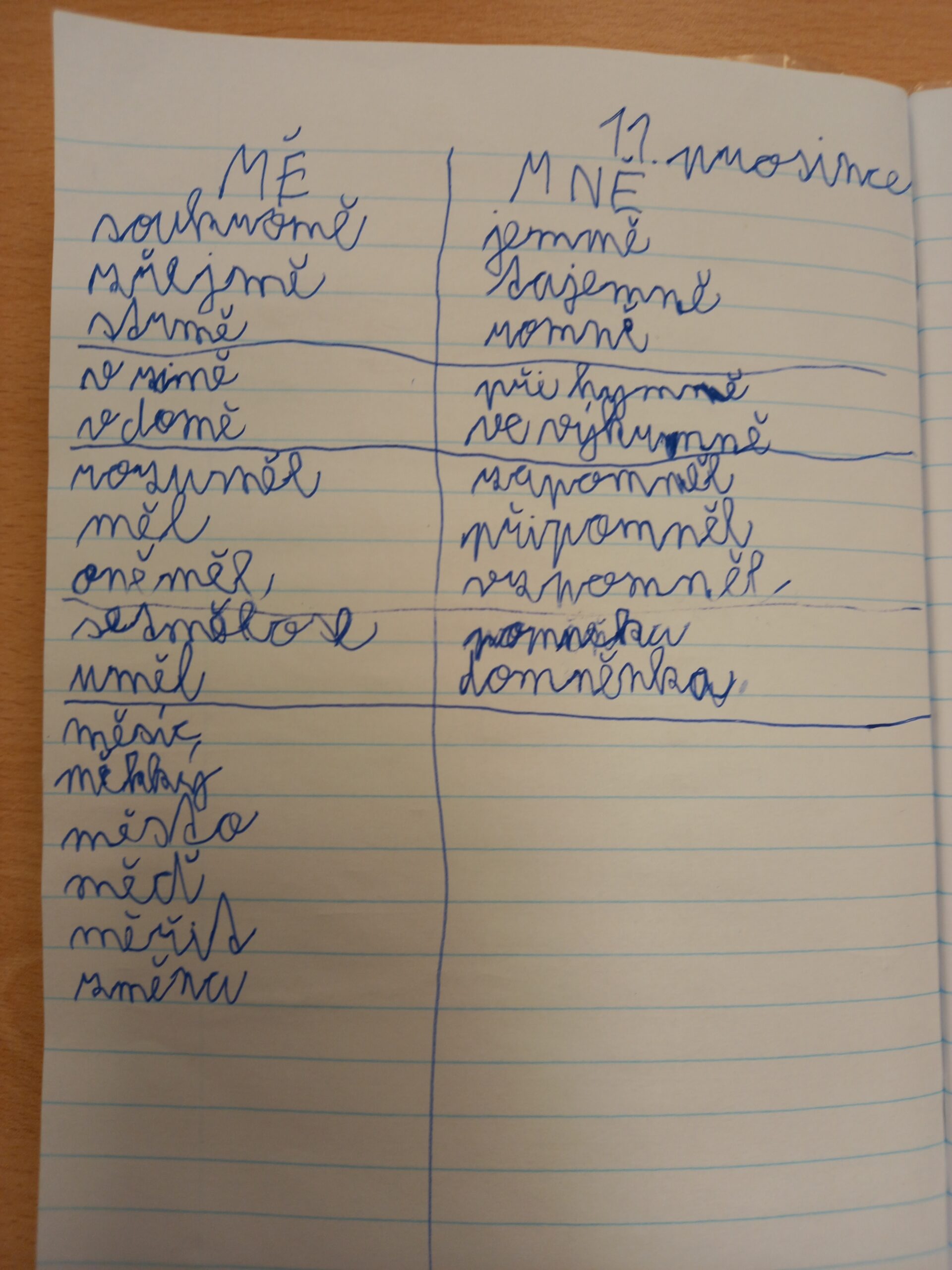 * Do sešitu nadepsat sloupeček MĚ a MNĚ, zdůvodňovat a zapisovat slova. V příloze je vidět, jak to pak má vypadat.