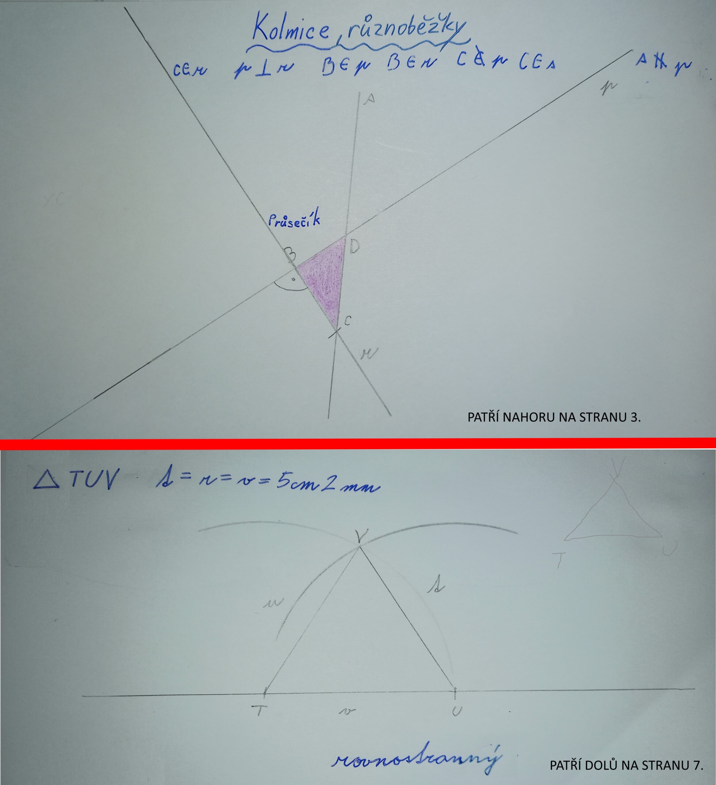 Matematika: Téma: Sčítání a odčítání čtyřciferných čísel. Různoběžky, kolmice. Aktivity: Početník str. 11,9, 10, případně předchozí strany. Sešit geometrie – různoběžky, kolmice (viz níže – zápisy jsou na dvou různých stranách).
