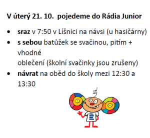 Čeká nás další tematický týden, tentokrát věnovaný stromům, neboť 20. října slavíme Den stromů. V úterý nás opět čeká malé odbočení od tématu – vyrazíme na exkurzi do Rádia Junior. Tato návštěva krásně naváže na páteční učivo z českého jazyka, kde jsme probírali monolog, dialog a interview.