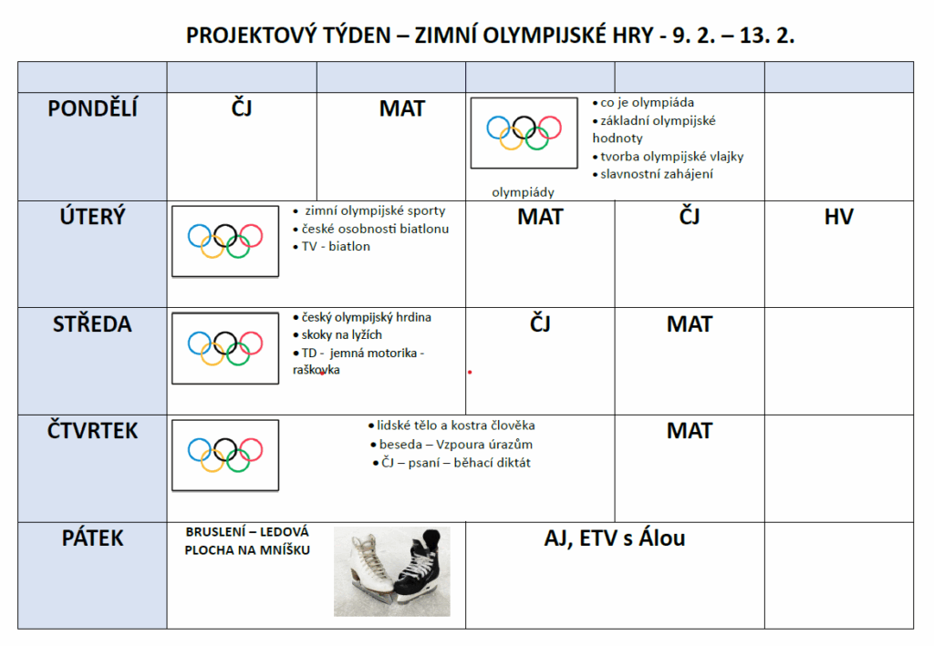 tento týden (i ten příští) se naše třídä promění v malé olympijské centrum. Společně se vydáme do světa zimních olympijských her, kde nepůjde jen o sportovní výkony, ale především o radost z pohybu, snahu, spolupráci a fair play chování. Děti se seznámí se symboly olympiády, základními zimními sporty a olympijskými hodnotami, které budeme během celého týdne přirozeně rozvíjet. Projekt propojí učení s pohybem, tvořením i přemýšlením o zdraví. Budeme objevovat, jak funguje lidské tělo při sportu, proč je důležité chránit své zdraví a jak se chovat bezpečně při pohybových aktivitách. Týden zakončíme společným sportovním zážitkem, který dětem umožní zažít olympiádu nejen hlavou, ale i srdcem.