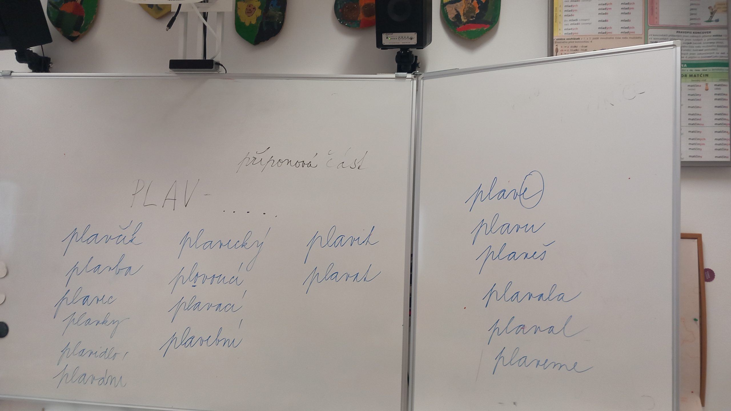 Čtvrtek ČJ: Věnovali jsme se koncovkám a příponám slov, jejich skloňování (viz foto tabule)