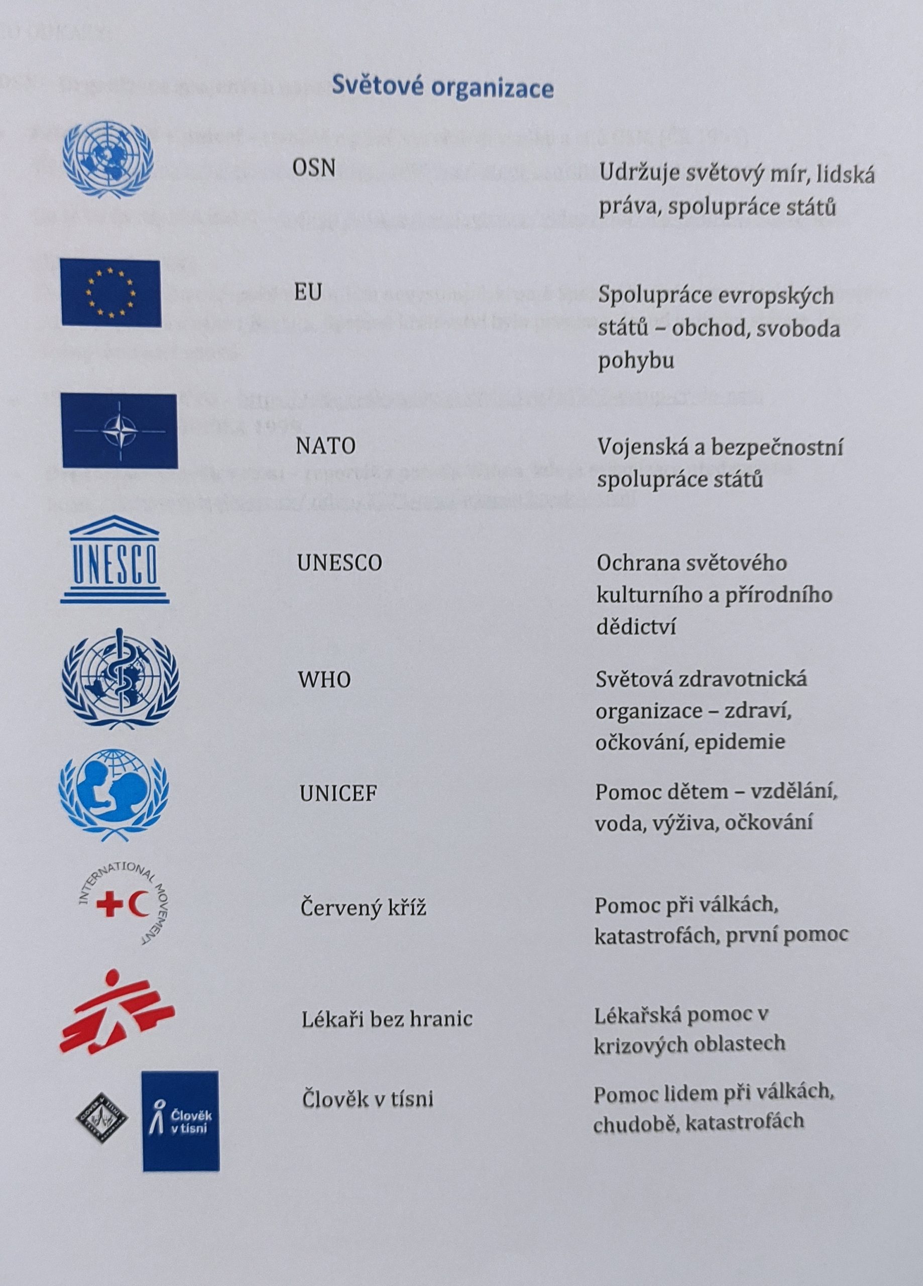 - Během dnešní hodiny jsme se učili o světových organizacích a o tom, proč jsou důležité. V přílohách najdete zápisky z hodiny – měly by být už nalepené ve vašem sešitě. Pokud je tam ještě nemáte, můžete si je stáhnout a doplnit.