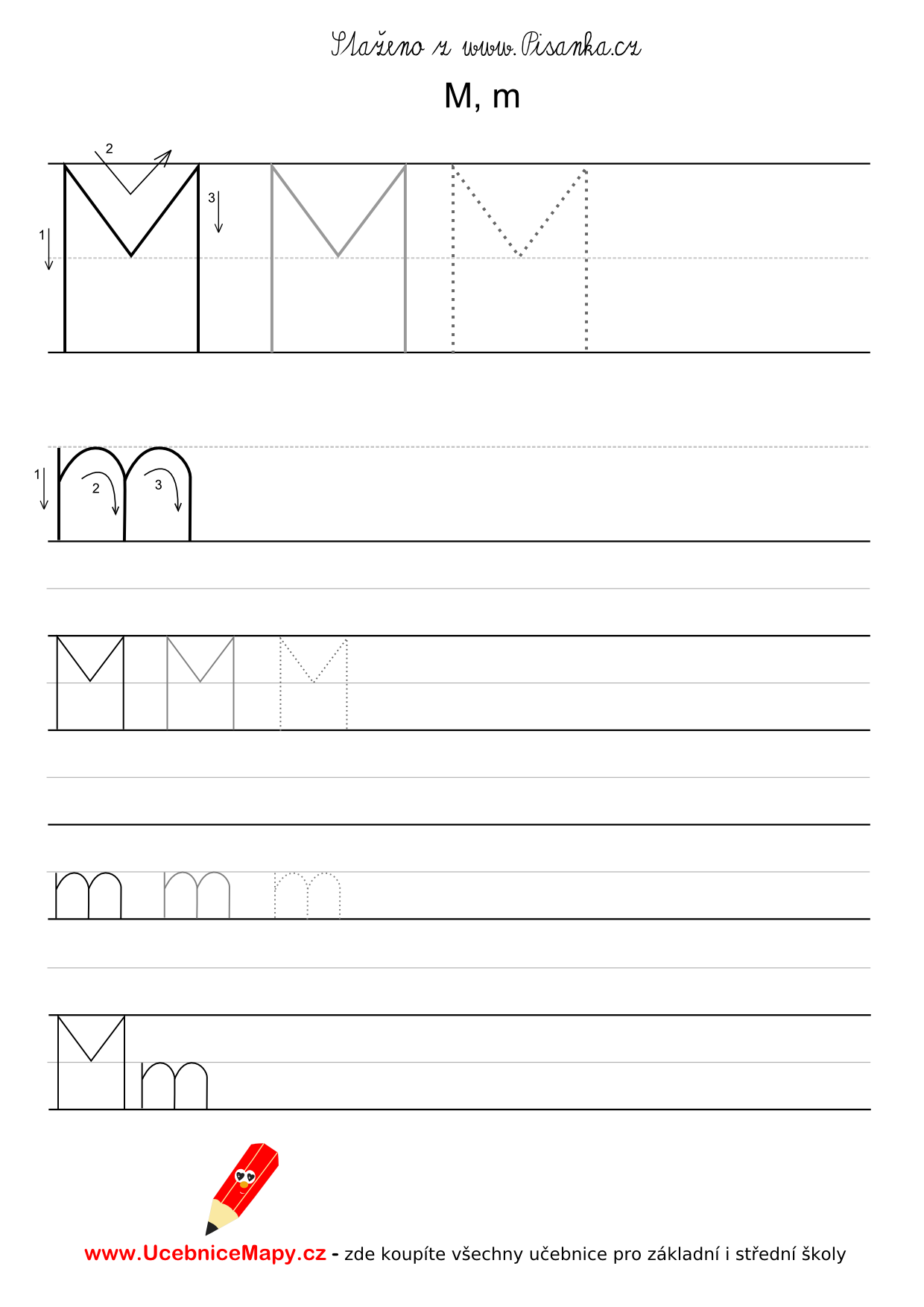 při češtině si dnes potrénujeme psaní písmene M. Kdo bude chtít, zkusí i malé tiskací, ale to nutně umět nemusíme 😉 (viz přiložený pracovní list).