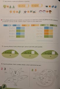 Při matematice upevníme používání znaménka + a rozklad čísel (např. 3 můžu rozložit na 2+1 či 1+2 atd.). V HRAVÉ MATEMATICE pracujeme na str. 18.