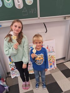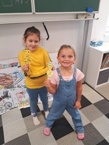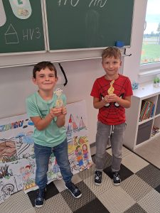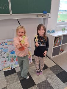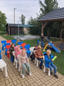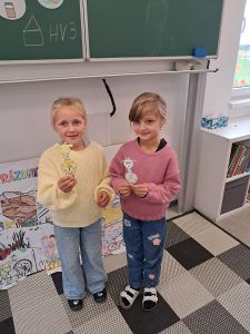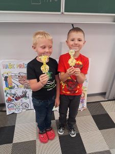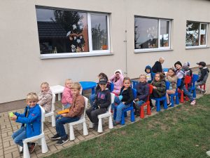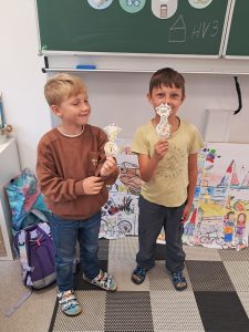 Při matematice rozvíjíme podzimní příběh o ježkovi a dětech a vždy přidáváme nějaké informace o počtu ovoce, které různě přibývá, ubývá, porovnáváme s použitím slov „více a méně“ a informace zakreslujeme tak, abychom dokázali odpovědět na více i méně záludné otázky :-).