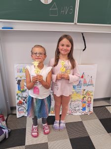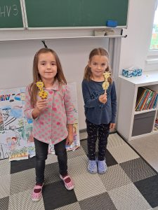 Při angličtině si zahrajeme „řeku“ – smluvené sigály na slova „river, hello, sit down, jump“ + přidáme „read“. Připomeneme si pozdravy „hello“ a „goodbye“ a vyrobíme si pomůcku, která nám umožní lepší zapamatování – můžete se na to vrhnout i doma. V příloze najdete žirafku, kterou si vytisknete na čtvrtku či na papír, vybravíte, vystříhnete a potom proti sobě nalepíte na devěnou špachtli či špejli tak, aby vám vznikla „loutka“ ;-). Do desek na angličtinu, které jsme vyrobili minulý týden, přidáme nový list a naučíme se barvy – ústně (viz příloha). Kolonku „food“ zatím necháme prázdnou.